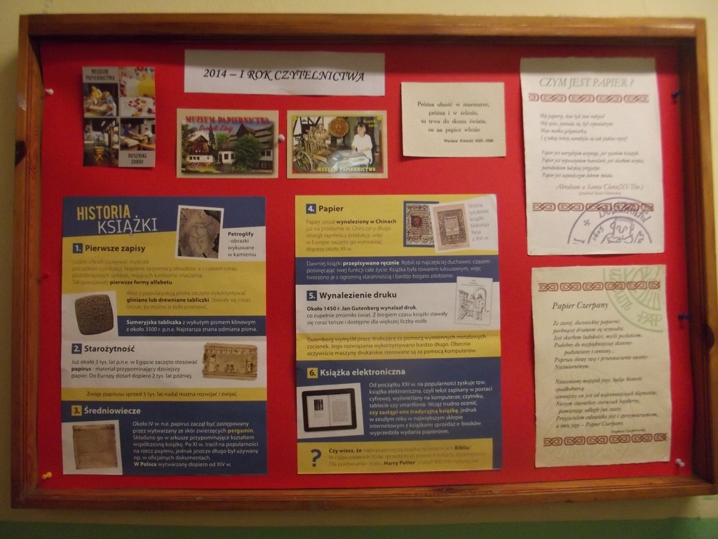 W bibliotece i na korytarzu szkolnym, uczniowie wykonali gazetki zachęcające do częstego odwiedzania książnicy oraz czytelni. Przedstawiono historię książki od pierwszych zapisów, poprzez starożytność, średniowiecze, wynalezienie papieru i druku, aż po książkę elektroniczną. Wypisano ciekawostki dotyczące książek i czytelnictwa, np.: Najpopularniejszą książką na świecie jest Biblia, której w ciągu ostatnich 50 lat sprzedano prawie 4 miliardy egzemplarzy. Dla porównania – trzeci „Harry Potter” znalazł 400 milionów nabywców. W szkolnej bibliotece można obejrzeć wystawkę „NAJ… BIBLIOTEKI”. Zakupiono kilkanaście ciekawych książek do wypożyczania których, serdecznie zapraszamy.