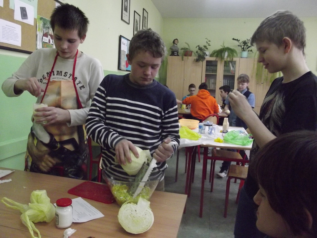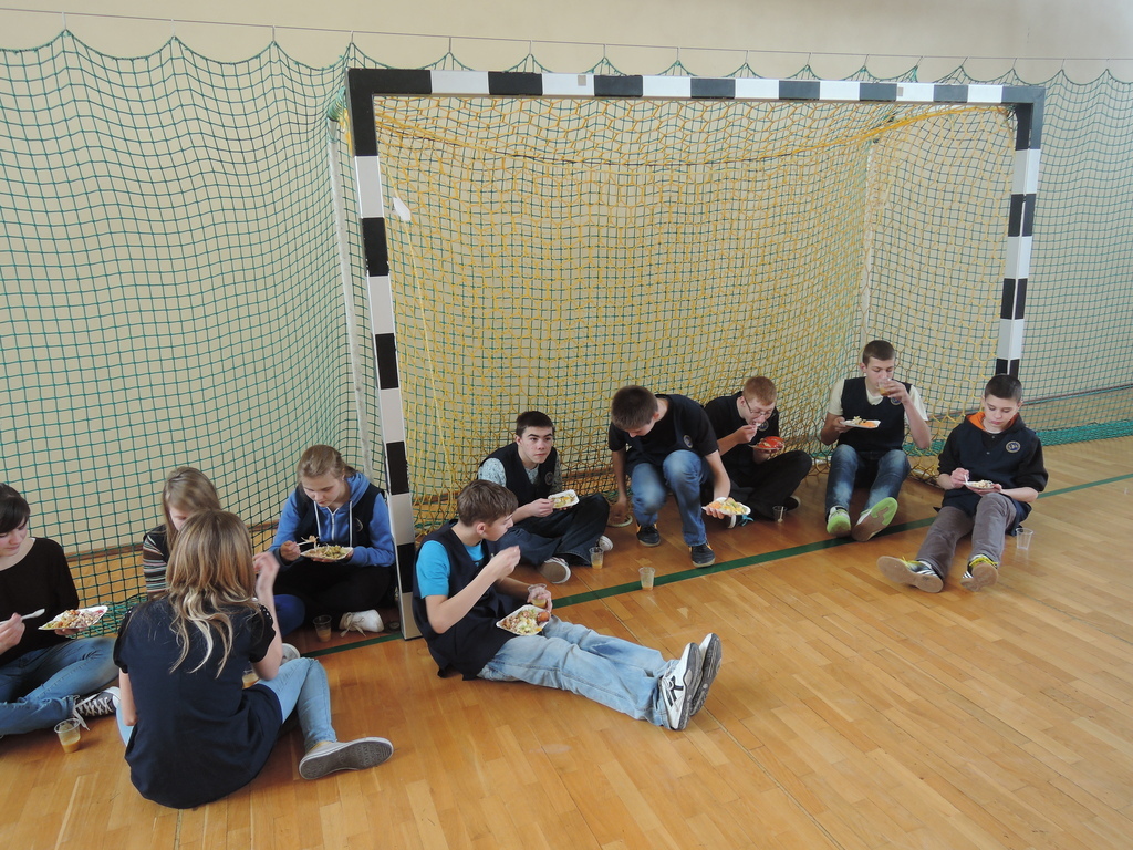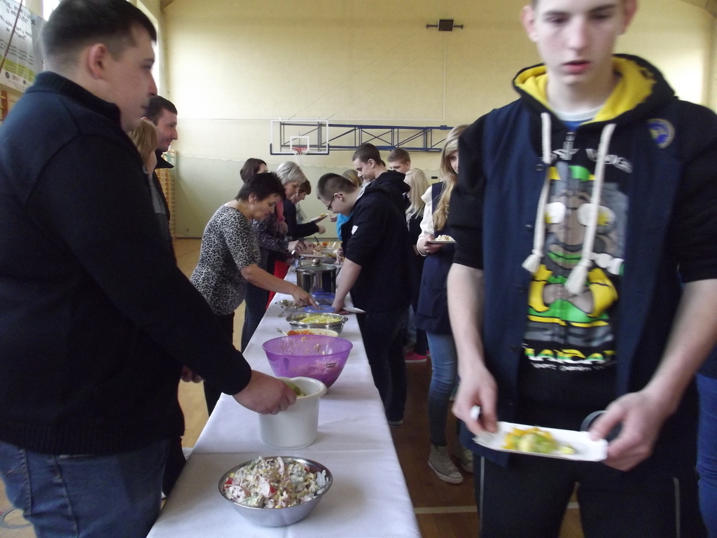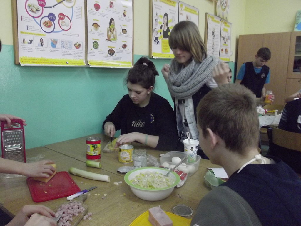 27 lutego w gimnazjum odbyły się warsztaty kulinarne pod hasłem „Lajtowy” Tłusty Czwartek. W tym dniu każdy uczeń mógł poczuć się jak Karol Okrasa i przyrządzić smaczną sałatkę lub zupę. Uczniowie zostali wcześniej podzieleni na 28 zespołów. Każdy miał za zadanie przygotować przydzieloną potrawę. Aby było smacznie i zdrowo, dominowały sałatki: brokułowe, marchewkowe i owocowe. Zostały przygotowane również zdrowe owocowe napoje i koktajle. Z pomocą uczniom przyszli chętni rodzice, rodzeństwo, nauczyciele oraz przedstawicielka UG w Kornowacu. W sumie przygotowano: 24 sałatki, 2 rodzaje napojów, przepyszną i zdrową zupę brokułową z grzankami, granolę oraz faszerowaną paprykę (wg przepisu naszych tureckich partnerów projektu Comenius). Tradycyjnie z okazji Tłustego Czwartku uczniowie smażyli własnoręcznie robione pączki twarogowe. Warsztaty trwały trzy godziny i zakończyły się wspólną degustacją przygotowanych potraw na sali gimnastycznej. Aby nic się nie zmarnowało, wszystkie odpadki biologiczne zostały wysypane na szkolny kompostownik, który użyźni nasz gimnazjalny ogródek.