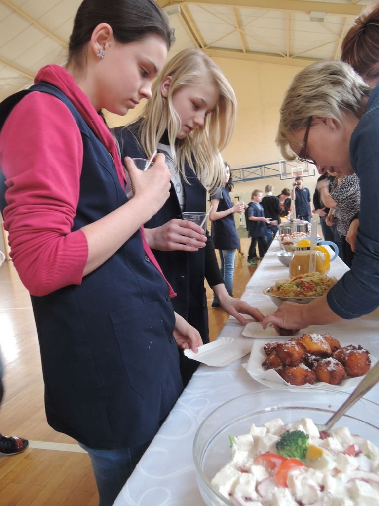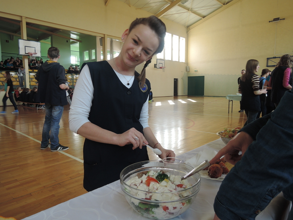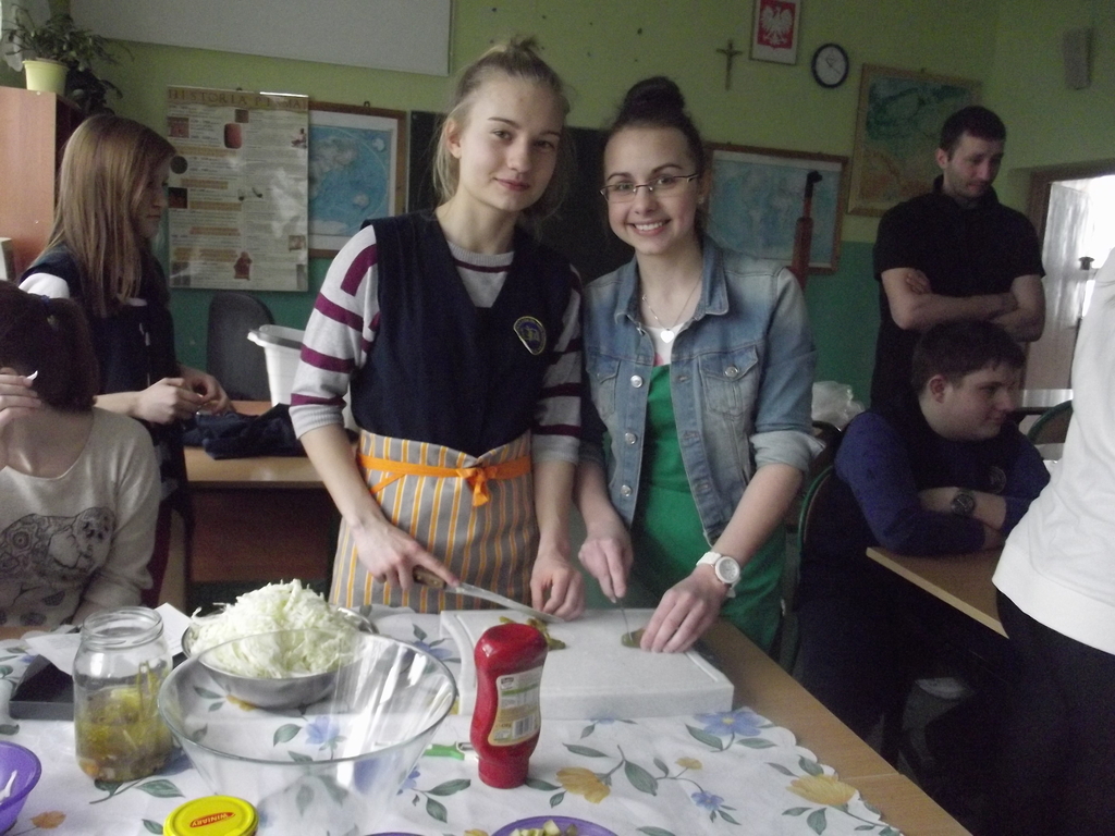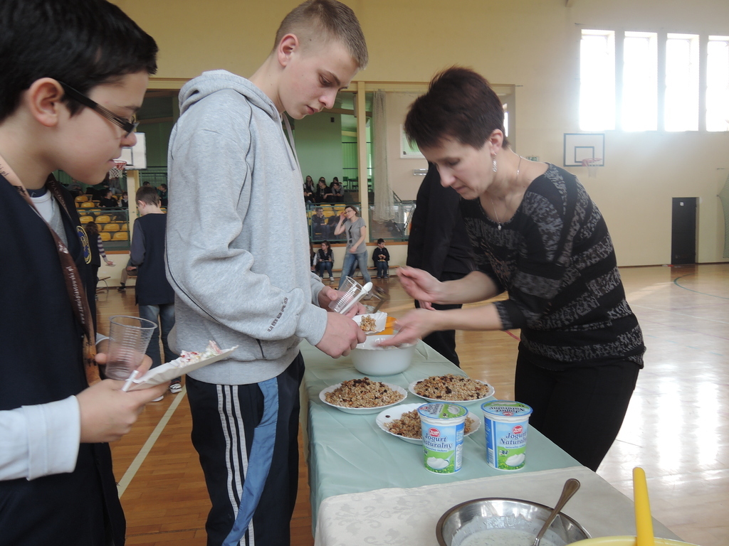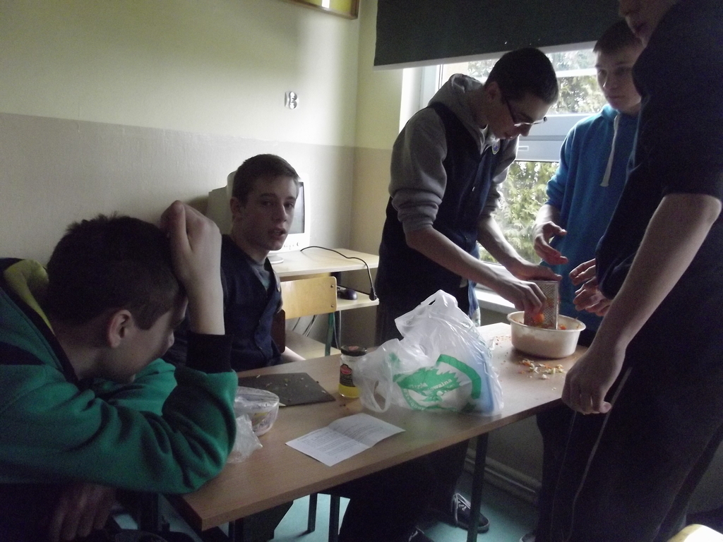 27 lutego w gimnazjum odbyły się warsztaty kulinarne pod hasłem „Lajtowy” Tłusty Czwartek. W tym dniu każdy uczeń mógł poczuć się jak Karol Okrasa i przyrządzić smaczną sałatkę lub zupę. Uczniowie zostali wcześniej podzieleni na 28 zespołów. Każdy miał za zadanie przygotować przydzieloną potrawę. Aby było smacznie i zdrowo, dominowały sałatki: brokułowe, marchewkowe i owocowe. Zostały przygotowane również zdrowe owocowe napoje i koktajle. Z pomocą uczniom przyszli chętni rodzice, rodzeństwo, nauczyciele oraz przedstawicielka UG w Kornowacu. W sumie przygotowano: 24 sałatki, 2 rodzaje napojów, przepyszną i zdrową zupę brokułową z grzankami, granolę oraz faszerowaną paprykę (wg przepisu naszych tureckich partnerów projektu Comenius). Tradycyjnie z okazji Tłustego Czwartku uczniowie smażyli własnoręcznie robione pączki twarogowe. Warsztaty trwały trzy godziny i zakończyły się wspólną degustacją przygotowanych potraw na sali gimnastycznej. Aby nic się nie zmarnowało, wszystkie odpadki biologiczne zostały wysypane na szkolny kompostownik, który użyźni nasz gimnazjalny ogródek.
