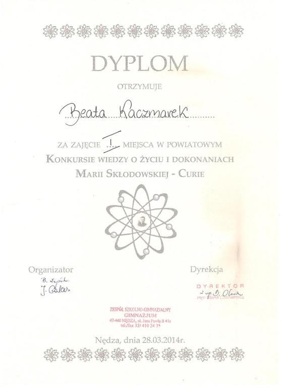 W piątek 28 marca trzyosobowa drużyna w składzie: Beata Kaczmarek z kl. IIb, Jakub Iksal z kl. IIb i Przemysław Burek z kl. IIIa reprezentowała gimnazjum w powiatowym „Konkursie wiedzy o życiu i dokonaniach Marii Skłodowskiej – Curie” w Zespole Szkolno – Gimnazjalnym w Nędzy. Celem konkursu było rozwijanie zainteresowań chemią jako nauką oraz propagowanie dokonań naukowych i niezwykłej osobowości Marii Skłodowskiej – Curie. W pierwszym etapie uczniowie zmagali się z testem dotyczącym życia i pracy dwukrotnej noblistki. W kolejnym etapie uczestnicy, którzy osiągnęli najwyższe wyniki z części pierwszej, rozwiązywali zadania z promieniotwórczości. Konkurs zakończył się sukcesem naszych reprezentantów – Beata Kaczmarek zdobyła miejsce pierwsze, a Przemysław Burek miejsce trzecie.