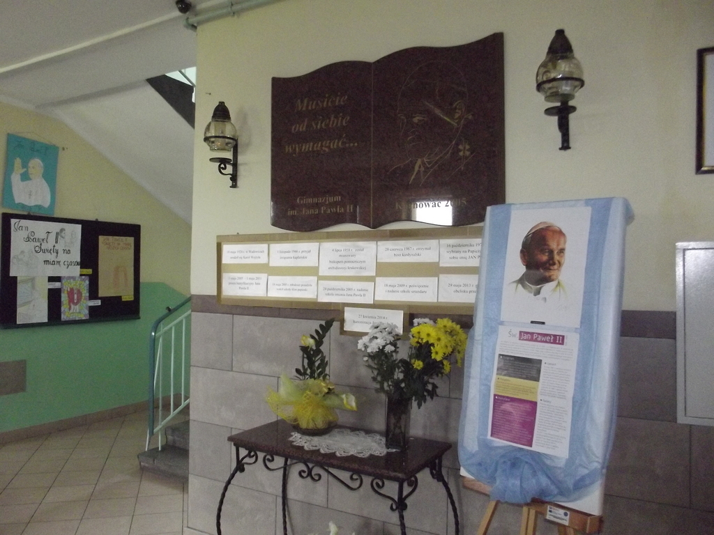 28 kwietnia 2014r. odbył się apel podsumowujący wydarzenia, które miały miejsce dzień wcześniej – uroczystość kanonizacyjną naszego Patrona – Jana Pawła II. Zostały przypomniane słowa z homilii papieża Franciszka oraz rola i wkład papieża Polaka w wychowanie młodzieży. Została wspomniana także postać drugiego kanonizowanego papieża Jana XXIII:
